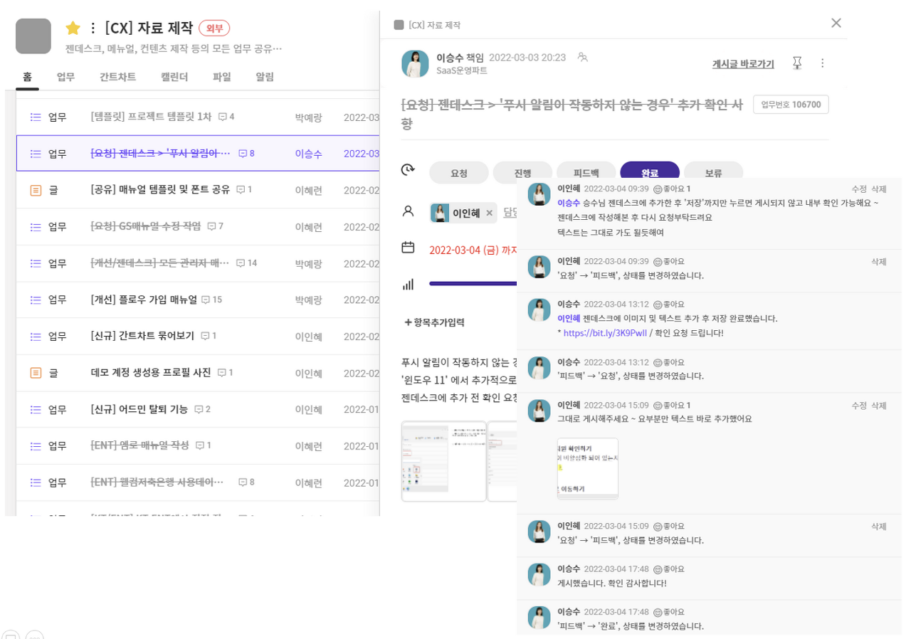 플로우 프로젝트 내에서는 각각의 업무 별 댓글로 업무 특이사항 및 진행사항이 공유되기 때문에