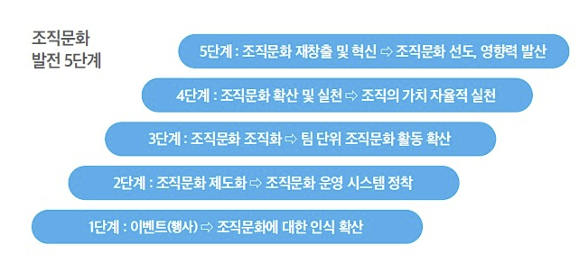 5단계(선도): 해당 조직문화를 이끄는 선도 역할을하여, 다른 회사의 벤치마킹 대상이 됩니다.