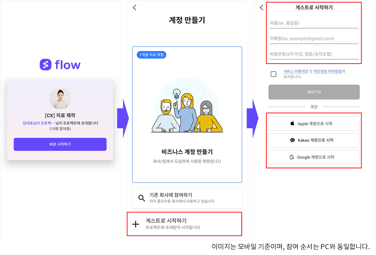 3) [게스트로 시작하기] > 회원 가입 또는 소셜 계정으로 바로 시작하기