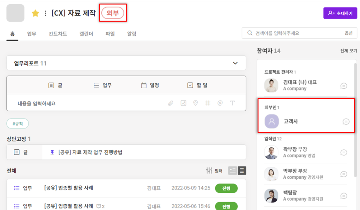 외부인과 함께 참여하고 있는 프로젝트에는 프로젝트 상단에 '외부' 아이콘이 표기됩니다.